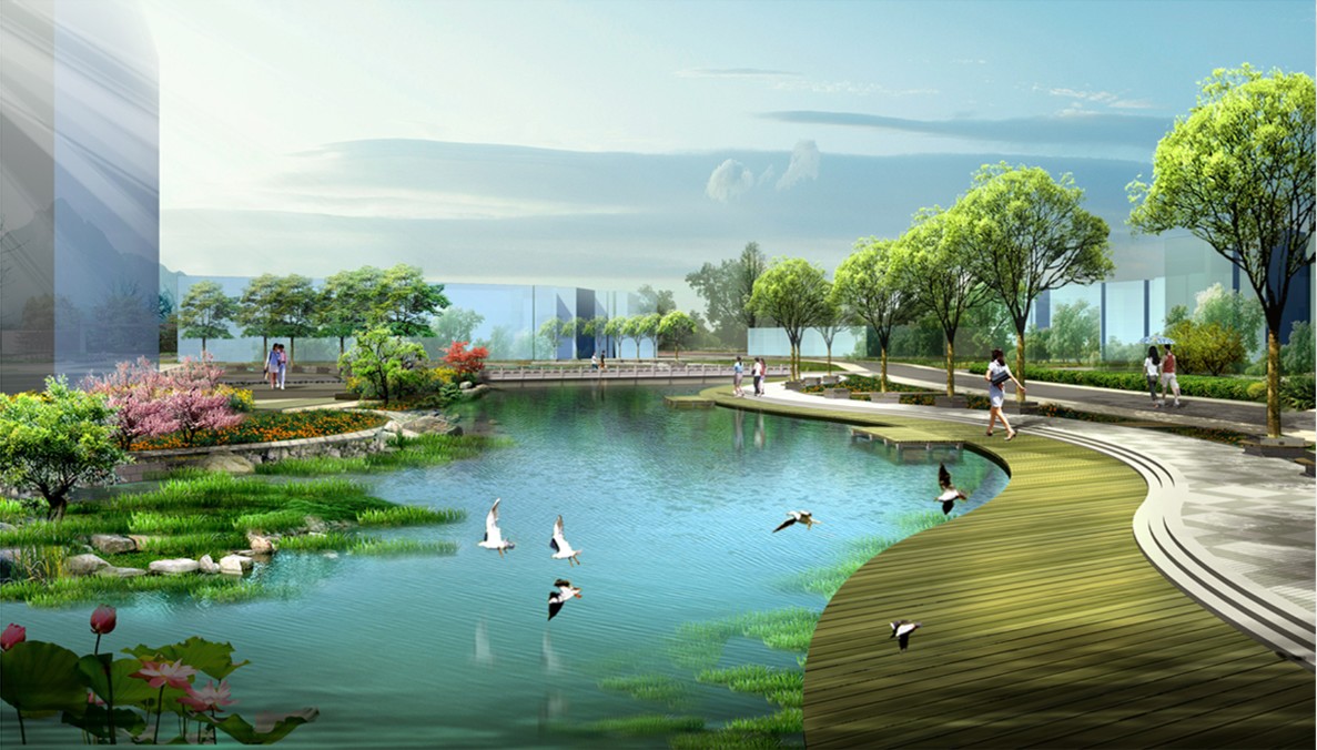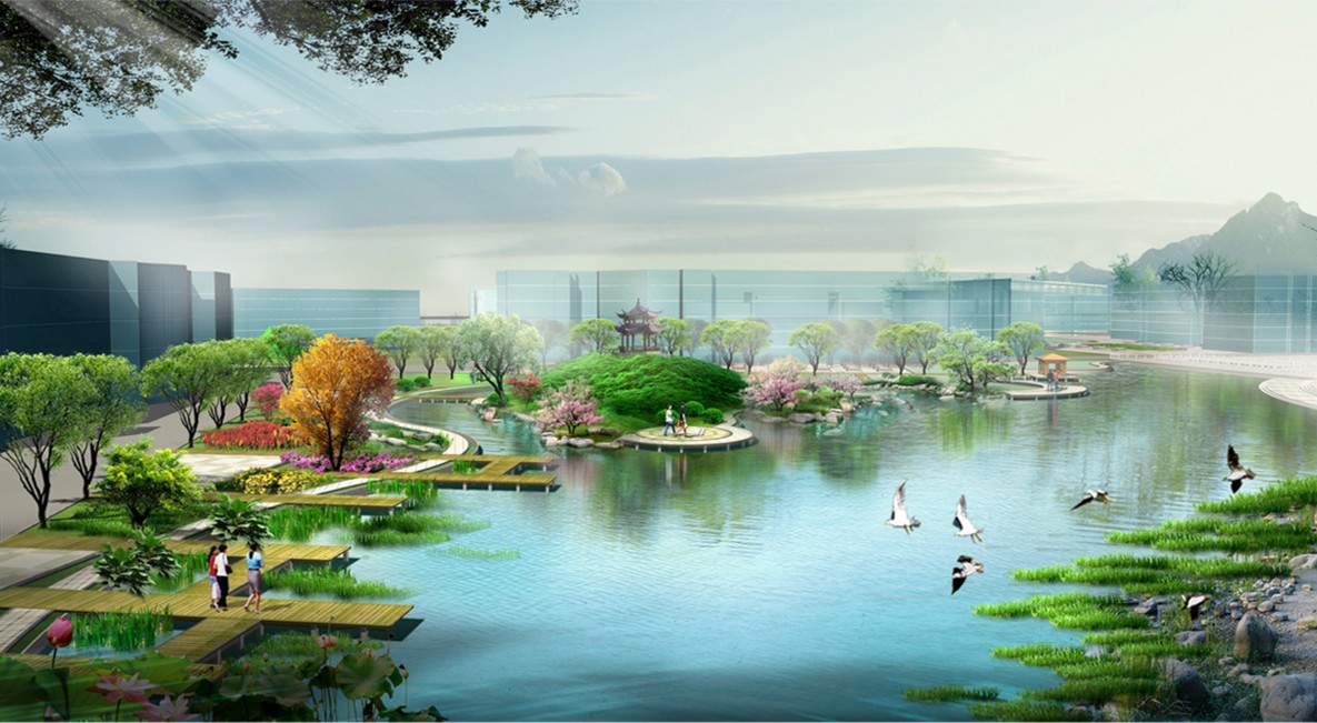 根據對場地的分析與設計理念的綜合考慮,形成“一山一水”的理念,以“三道一環,五個景點、七個功能分區”為特色的景觀構架(南為文正湖,北為裕澤湖)。