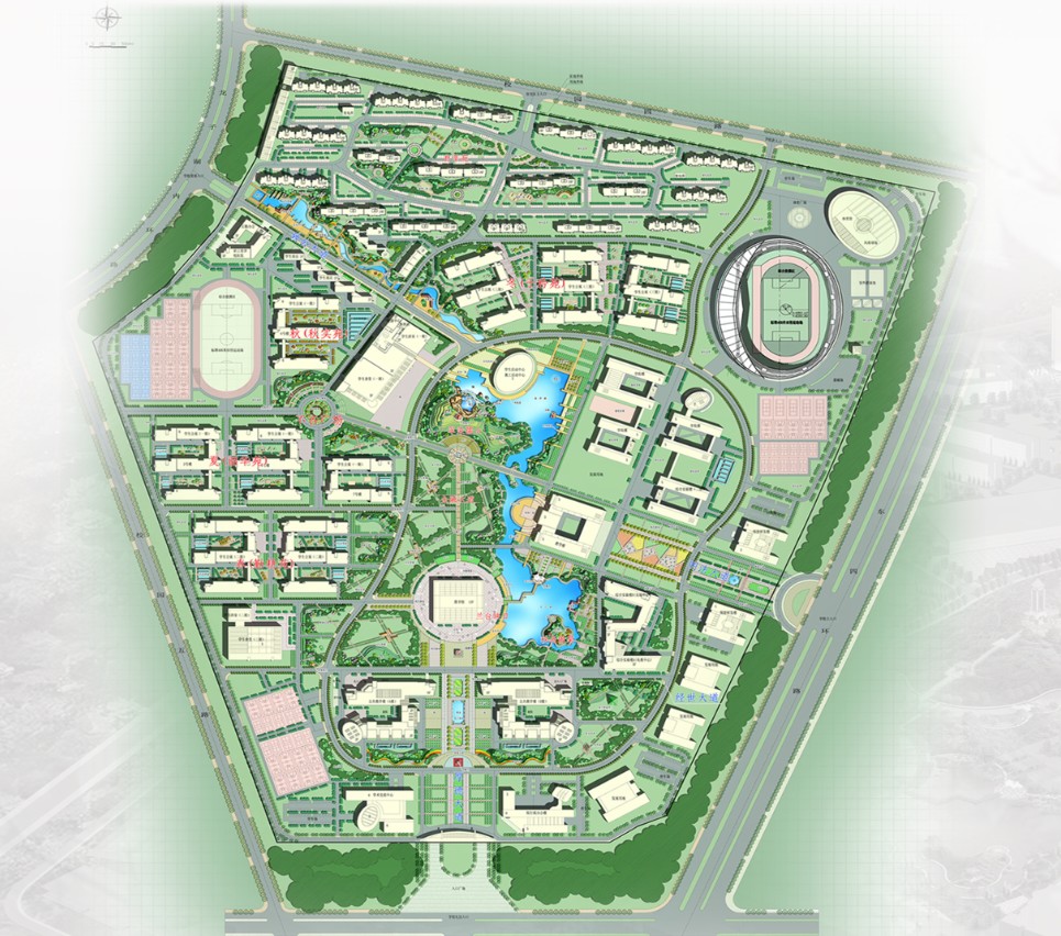 河南財經政法大學新校區位于鄭州市鄭東新區龍子湖畔,南側為金水東路。