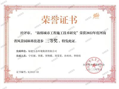 海綿城市工程施工技術研究榮獲2022年度河南省風景園林科技進步獎三等獎