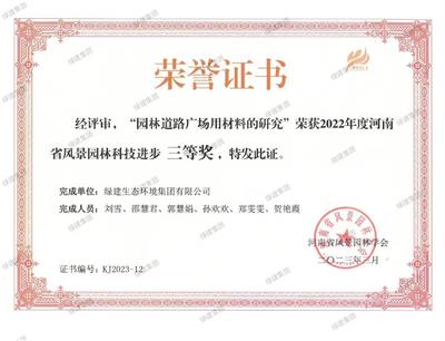 園林道路廣場用材料的研究榮獲2022年度河南省風景園林科技進步獎三等獎