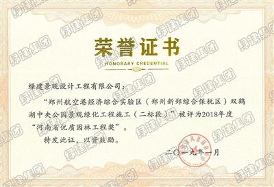 雙鶴湖二標榮獲2018年度河南省優質園林工程獎