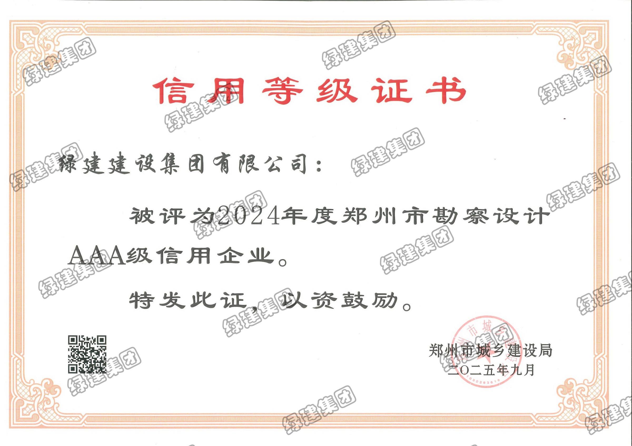 2024年度鄭州市勘察設計AAA級信用企業(yè)