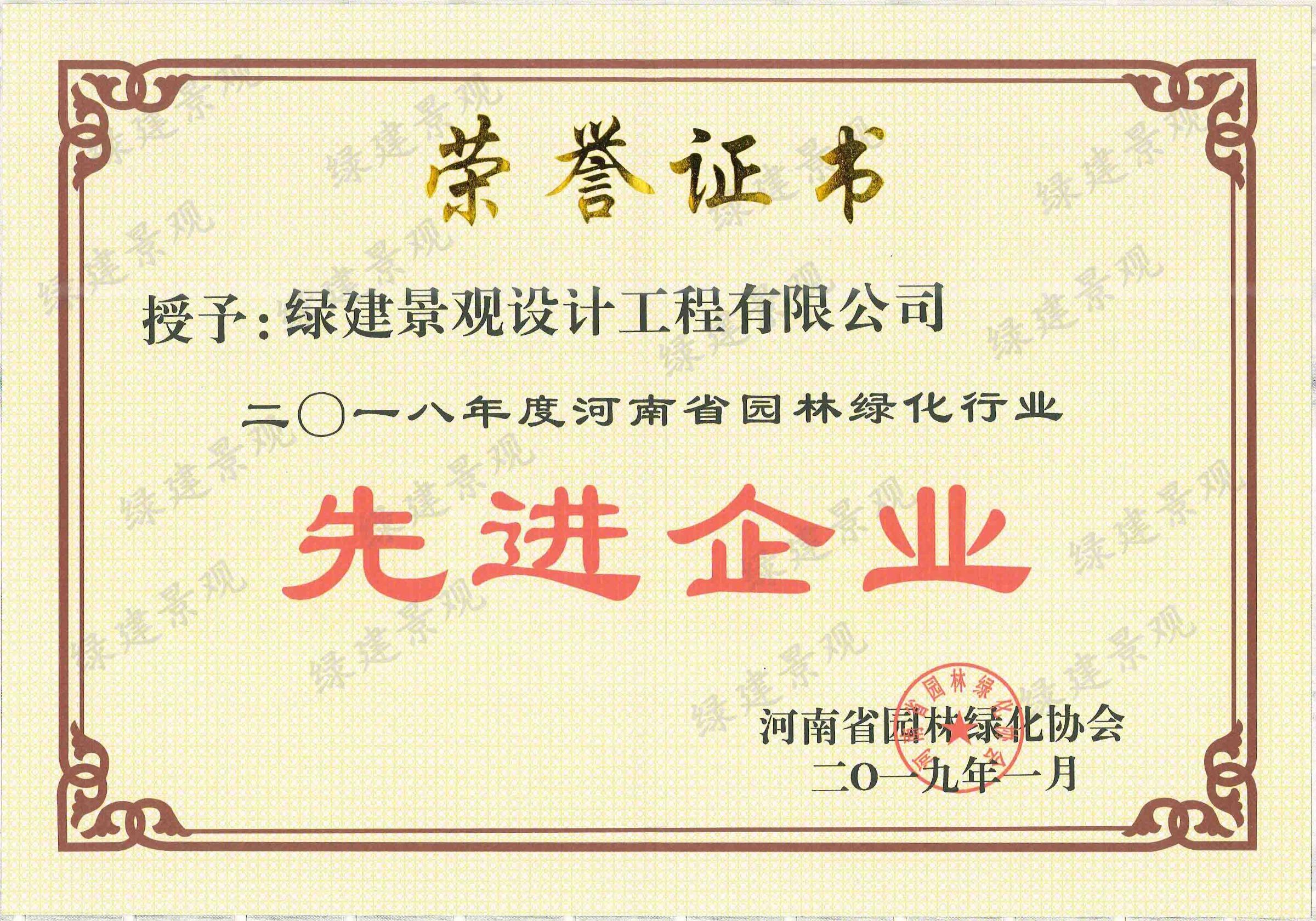 2018年度河南省園林綠化行業(yè)先進企業(yè)獎