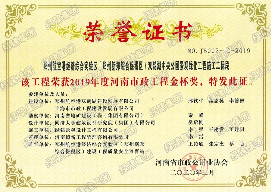 雙鶴湖二標(biāo)榮獲2019年度河南市政工程金杯獎(jiǎng)