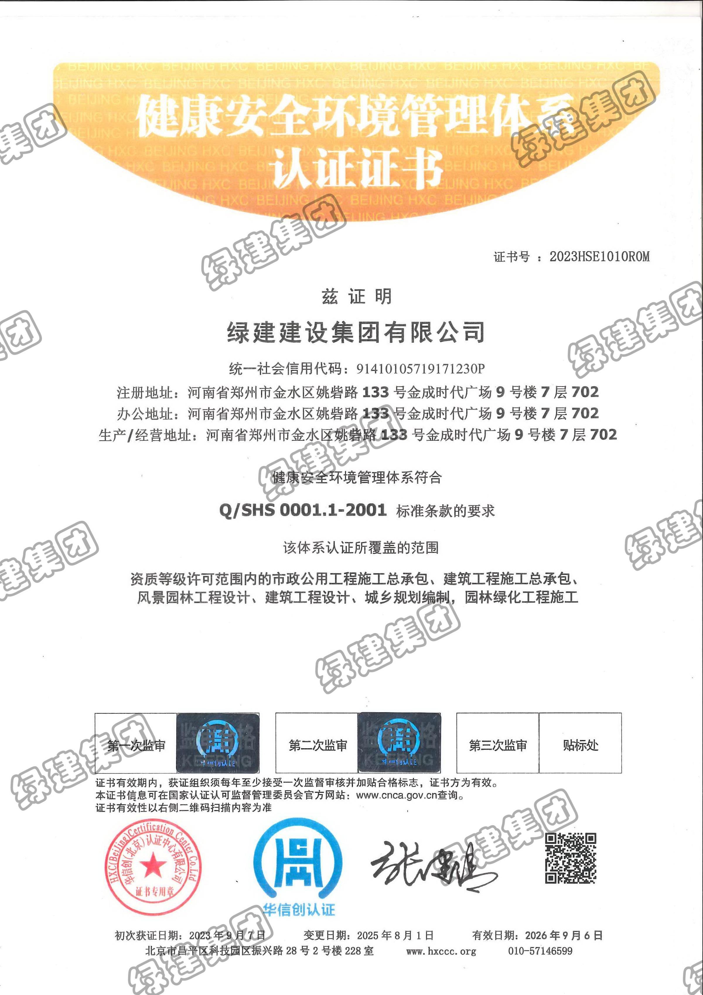 HSE健康安全環境管理體系證書(0001.1-2001)