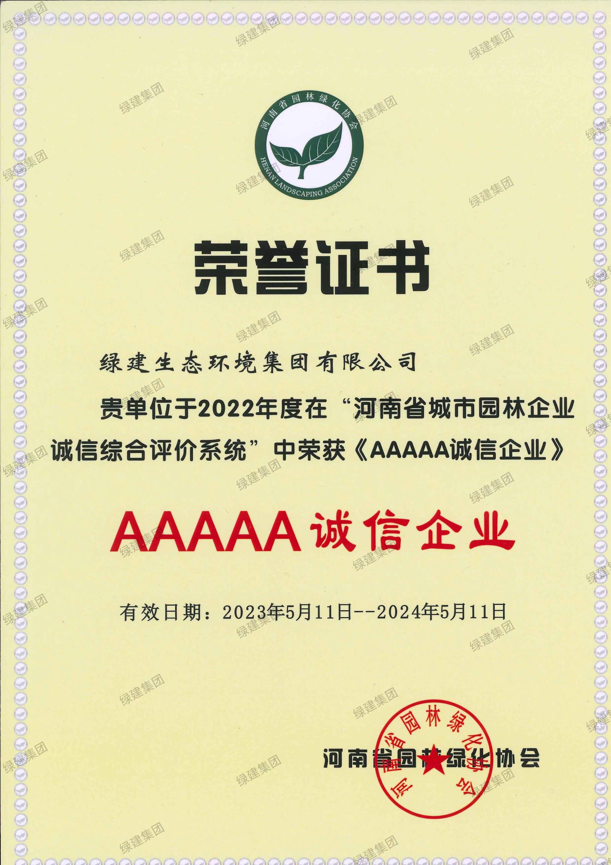 河南省園林綠化協會5A證書2023.5-2024.5